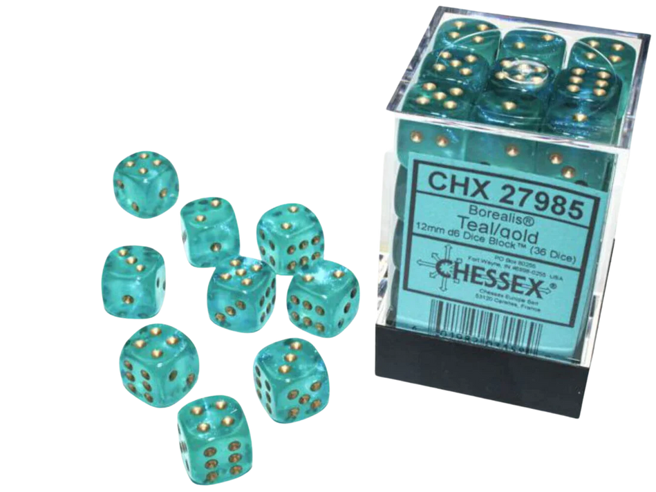Elevate your gaming experience with the Chessex Borealis 12mm d6 Teal/Gold Luminary Dice Block, featuring 36 premium six-sided dice in a dazzling teal and gold luminary finish. Each die is crafted with precision for balanced rolls and a satisfying feel, making them ideal for tabletop role-playing games (RPGs), board games, and any gaming session where style and quality matter13.