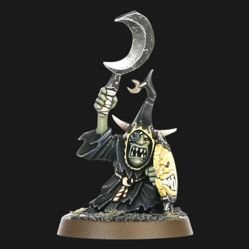 Moonclan Stabbas form ragged ranks that advance upon the foe with gongs clanging and banners waving. Eyes bulging with the madness of the Gloomspite, they pour over the enemy lines and stab wildly at everything in their path.